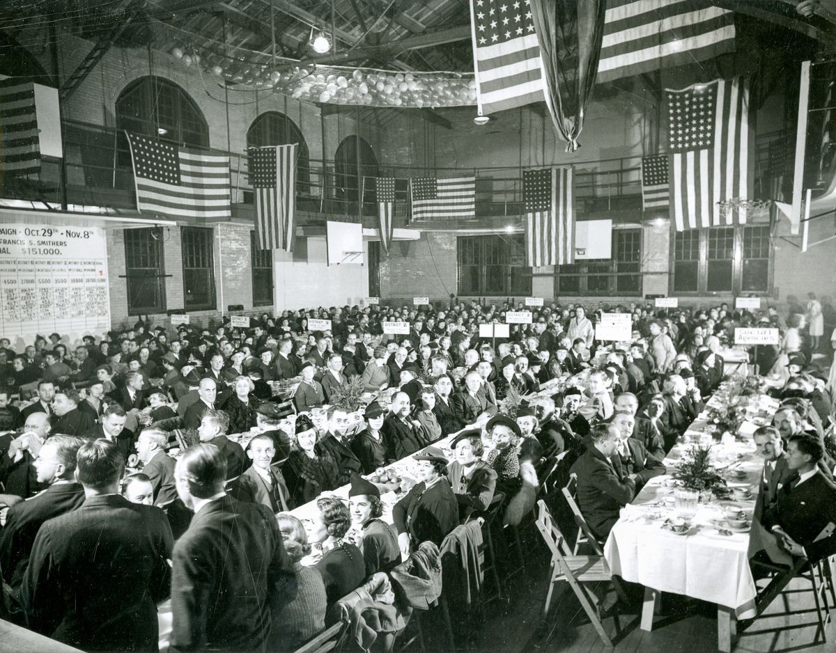 People attending a charity event, sitting at long tables in a room with many American flags.