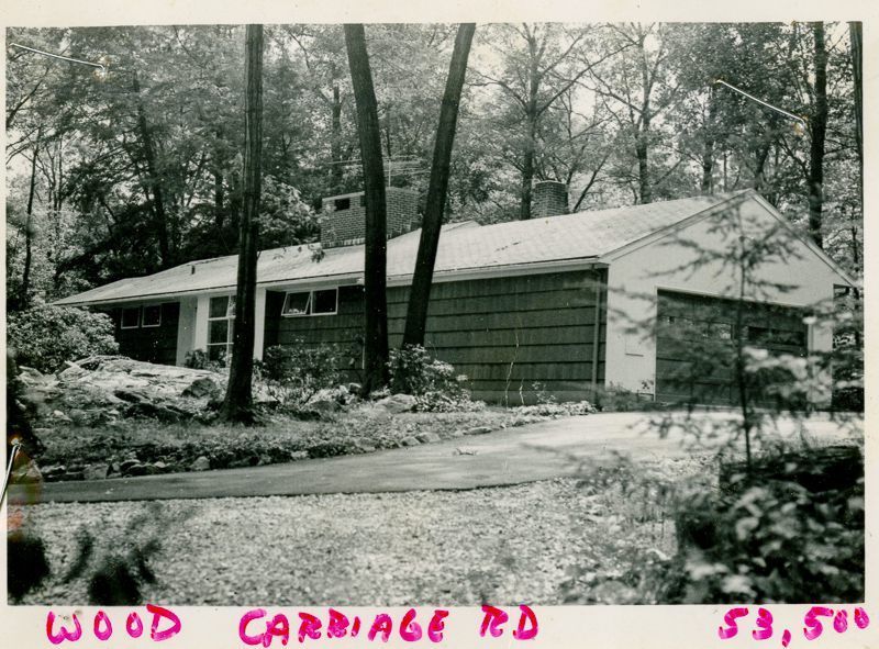 Ranch house built in 1957 with shingle siding and a garage viewed from its lawn.