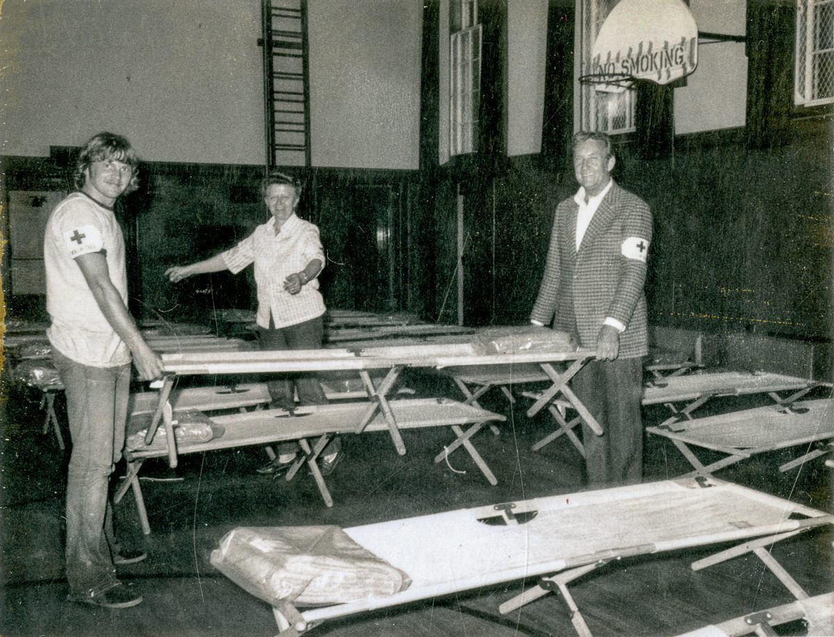 Three people setting up cots in preparation for a Red Cross sponsored blood-drive.