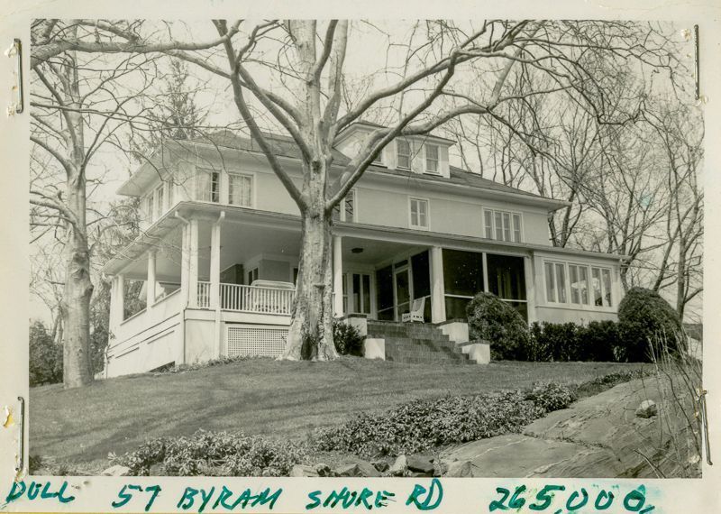 Colonial style house built in the early 1920's with a partially screened in wraparound porch viewed from its lawn.Collection