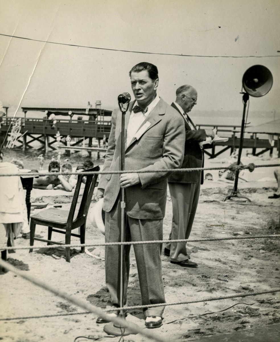 Former World Heavyweight Champion and Stamford resident Gene Tunney emceeing Island Beach Day.Collection