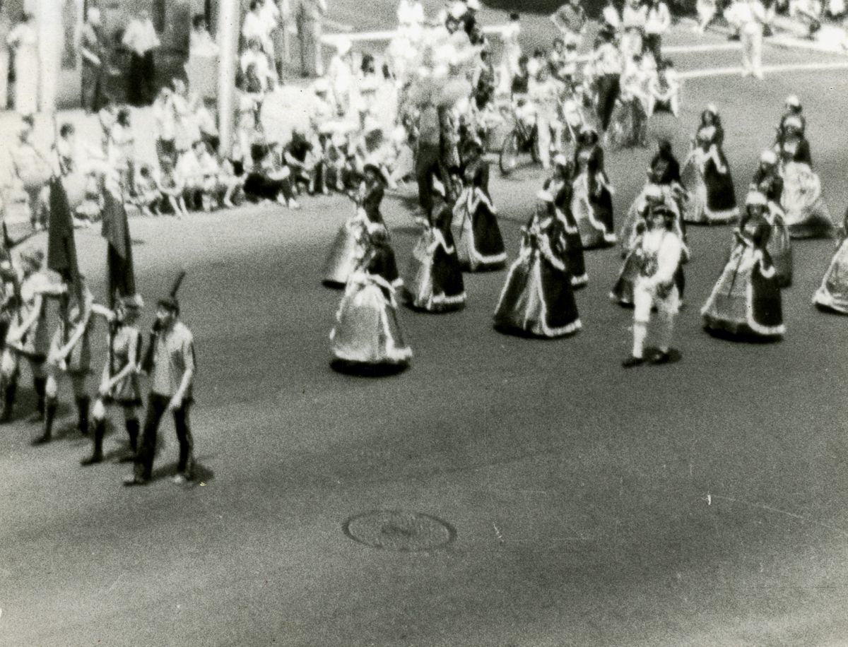 Bands, firetrucks, police officers, and others marching in a Bicentennial parade along East Putnam Avenue.Collection