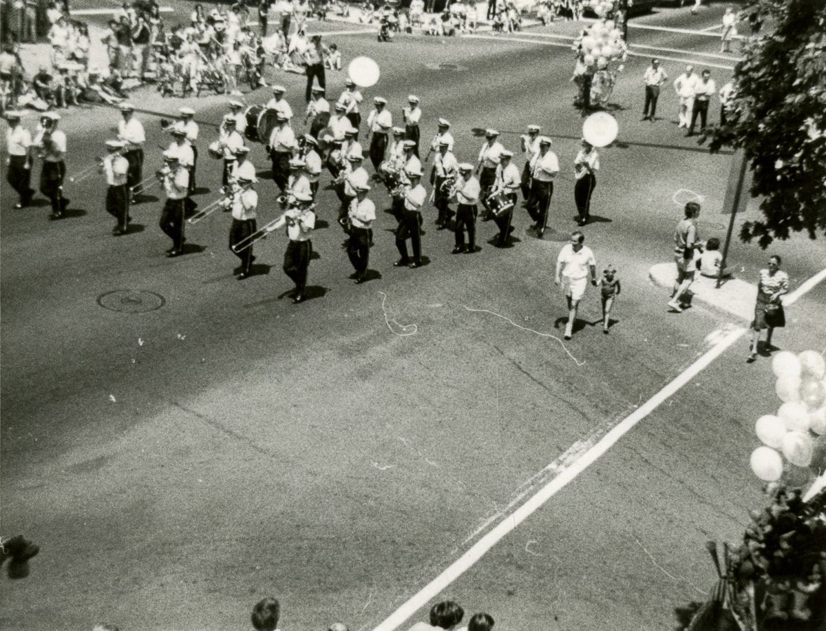 Bands, firetrucks, police officers, and others marching in a Bicentennial parade along East Putnam Avenue.Collection