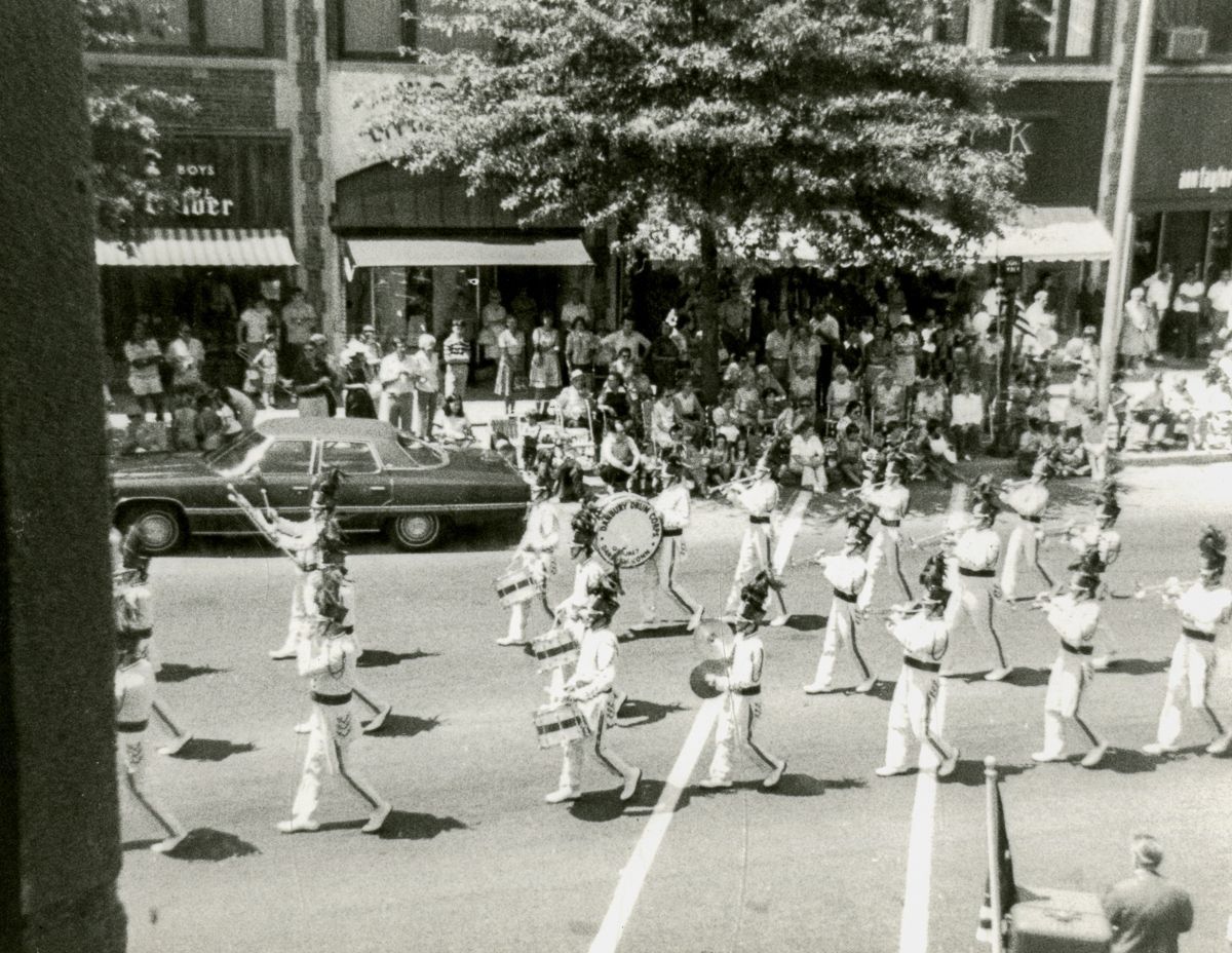Bands, firetrucks, police officers, and others marching in a Bicentennial parade along East Putnam Avenue.Collection