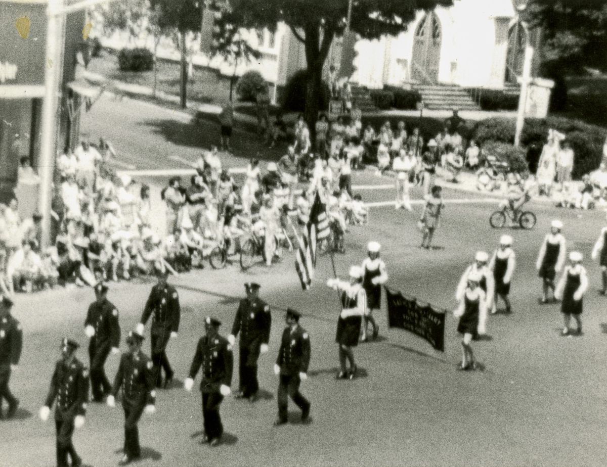 Bands, firetrucks, police officers, and others marching in a Bicentennial parade along East Putnam Avenue.Collection