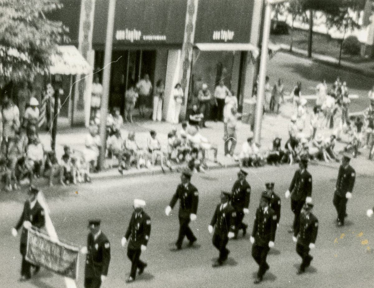 Bands, firetrucks, police officers, and others marching in a Bicentennial parade along East Putnam Avenue.Collection