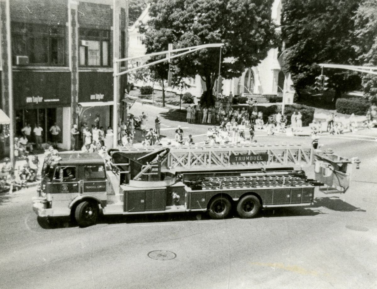 Bands, firetrucks, police officers, and others marching in a Bicentennial parade along East Putnam Avenue.Collection
