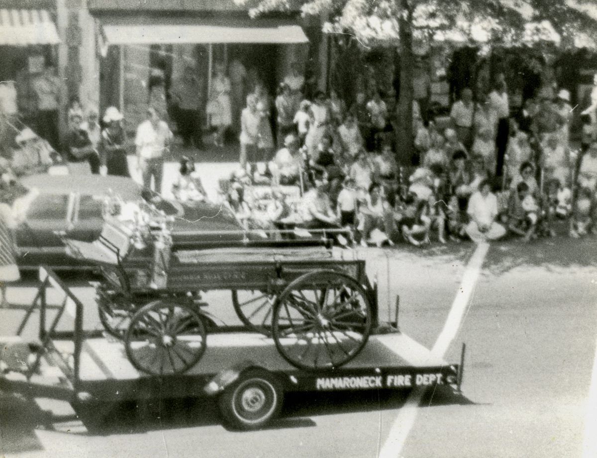 Bands, firetrucks, police officers, and others marching in a Bicentennial parade along East Putnam Avenue.Collection