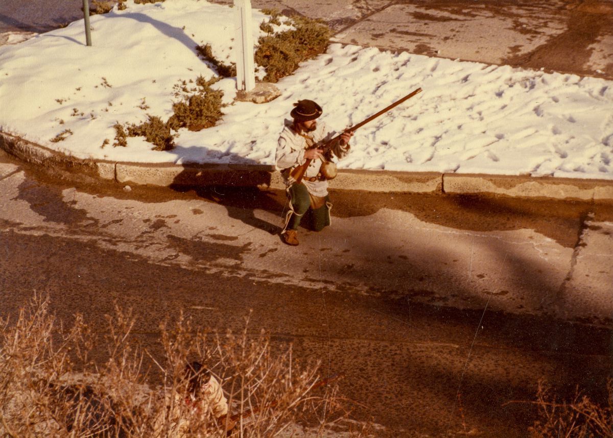 People in Revolutionary War-era British and American uniforms participating in a reenactment of the 1781 British raid on the Lower Landing in Cos Cob.Collection