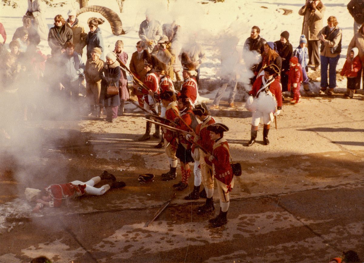 People in Revolutionary War-era British and American uniforms participating in a reenactment of the 1781 British raid on the Lower Landing in Cos Cob.Collection