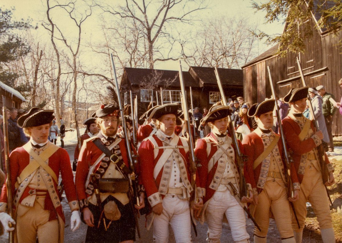 People in Revolutionary War-era British and American uniforms participating in a reenactment of the 1781 British raid on the Lower Landing in Cos Cob.Collection