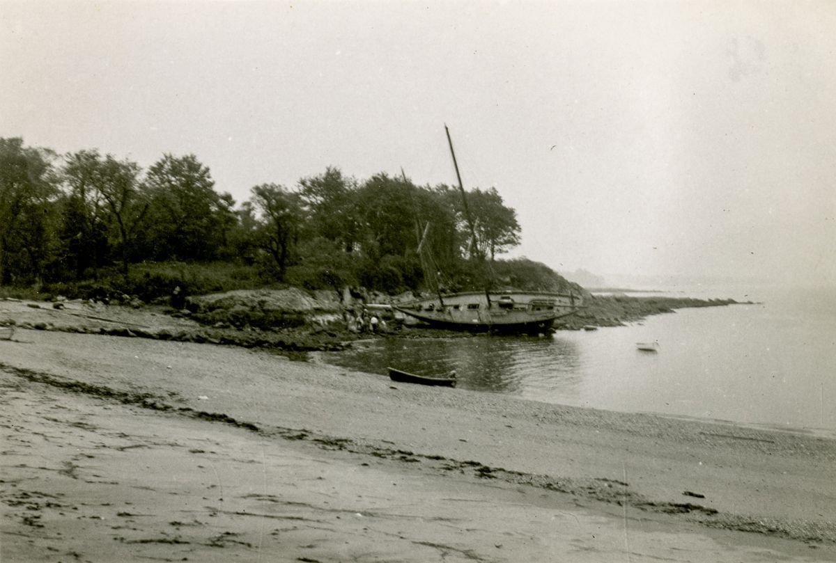 The boat "Caroline" beached on Calf Island off the coast of Byram; the boat was likely beached in a hurricane.