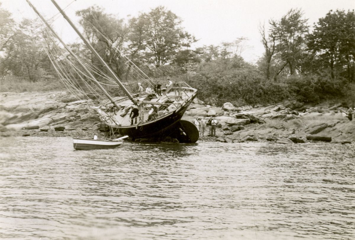The boat "Caroline" beached on Calf Island off the coast of Byram; the boat was likely beached in a hurricane.