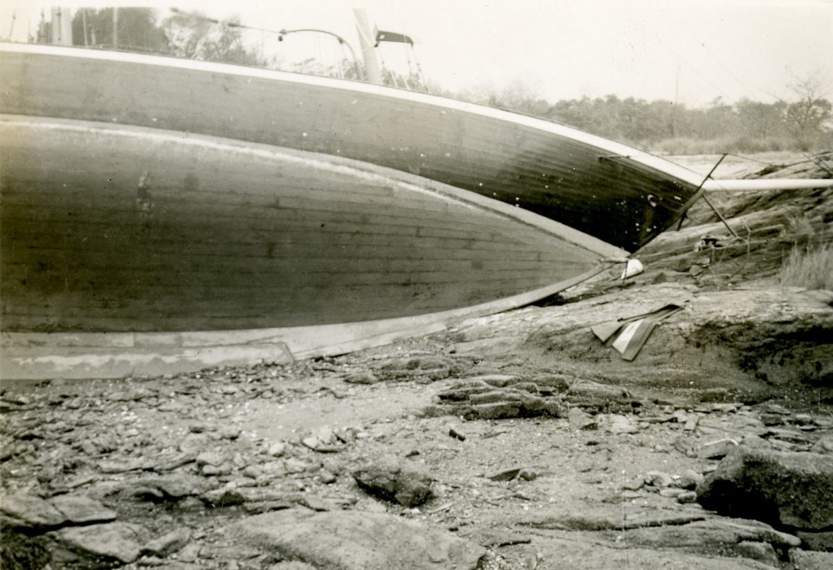 The boat "Caroline" beached on Calf Island off the coast of Byram; the boat was likely beached in a hurricane.