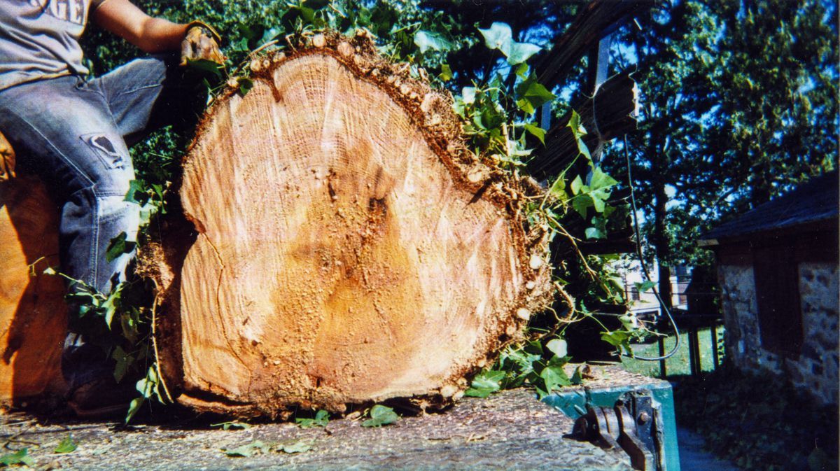 Images of the removal of an old, ivy-covered tree that stood by the south side of the Bush-Holley House.