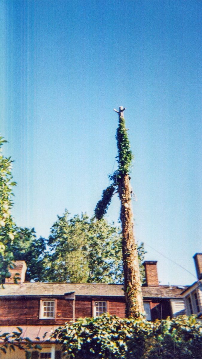 Images of the removal of an old, ivy-covered tree that stood by the south side of the Bush-Holley House.