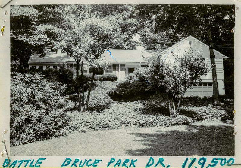 Colonial ranch house built in 1953 with a garage viewed from its lawn.