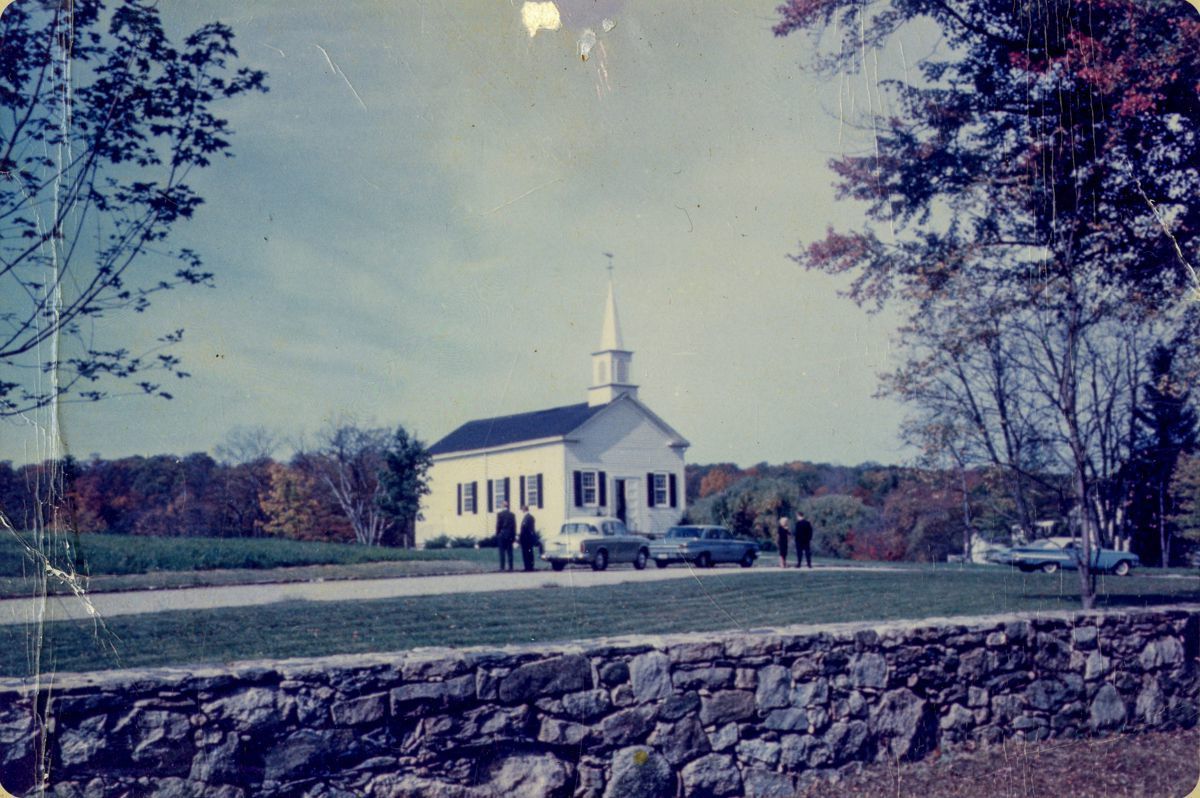 A view from Stanwich Road of Dingletown Community Church with parked cars on its drive.