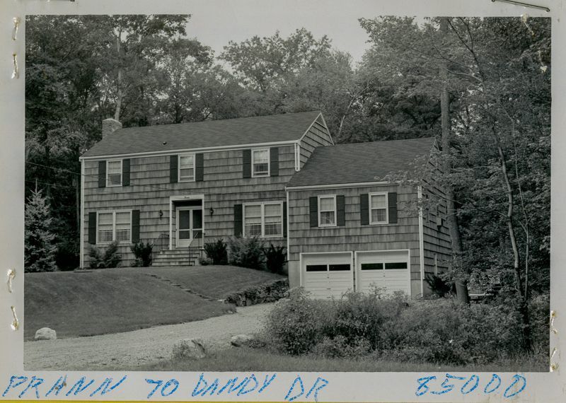 Colonial-style house built in 1966 with shingle siding and a two door garage viewed from the street.