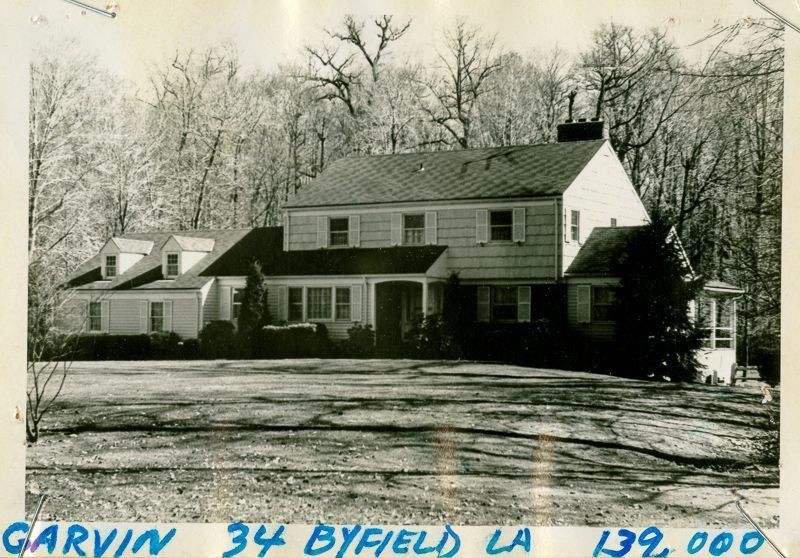 Colonial-style house built in the mid 1960's viewed from its lawn.