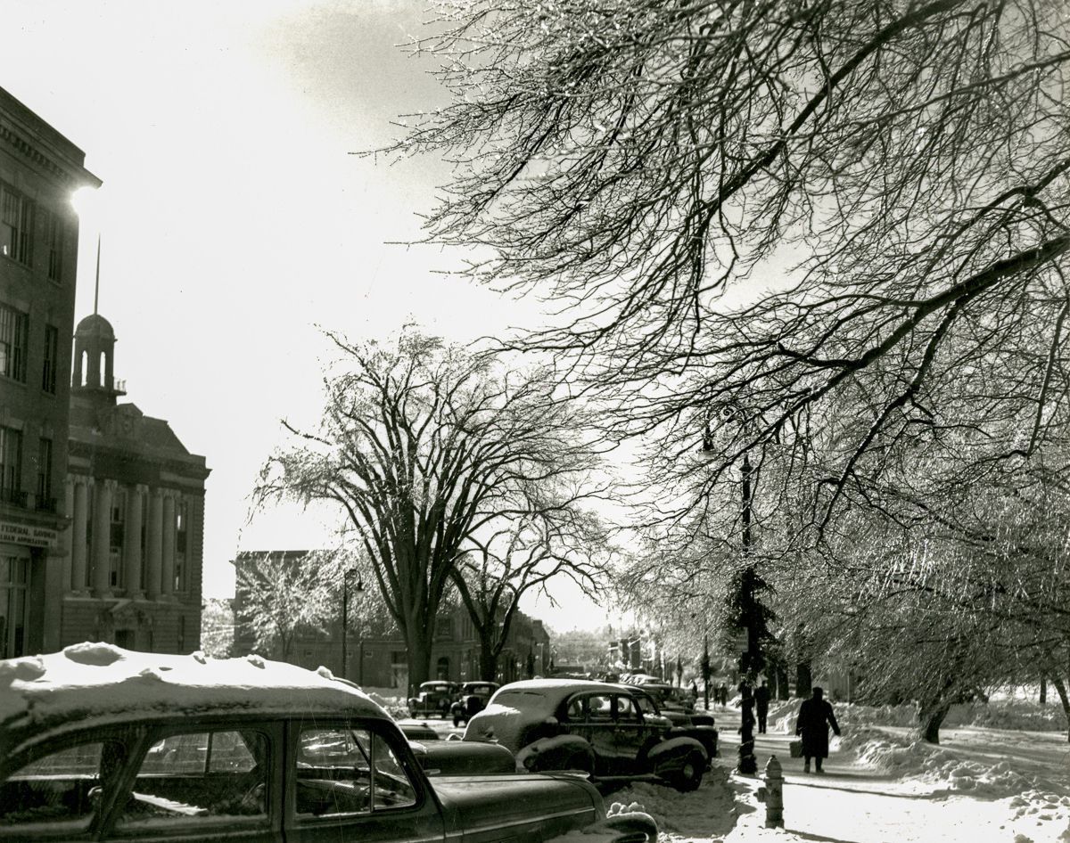 Looking down Greenwich Avenue after an ice storm; cars are parked along the sidewalk where people are walking under the ice-covered trees.Collection