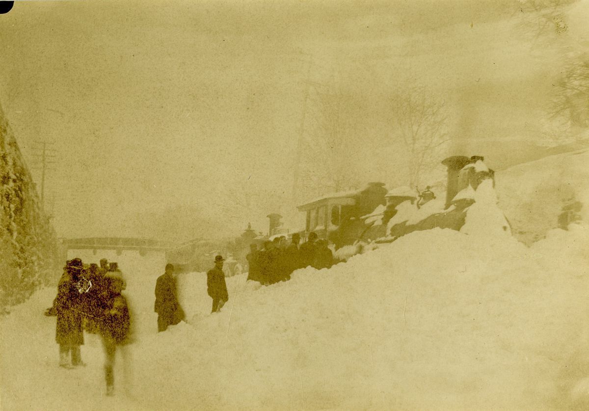 A group of people standing around a snowed-in locomotive after the March 12th and 13th Blizzard of 1888.Collection