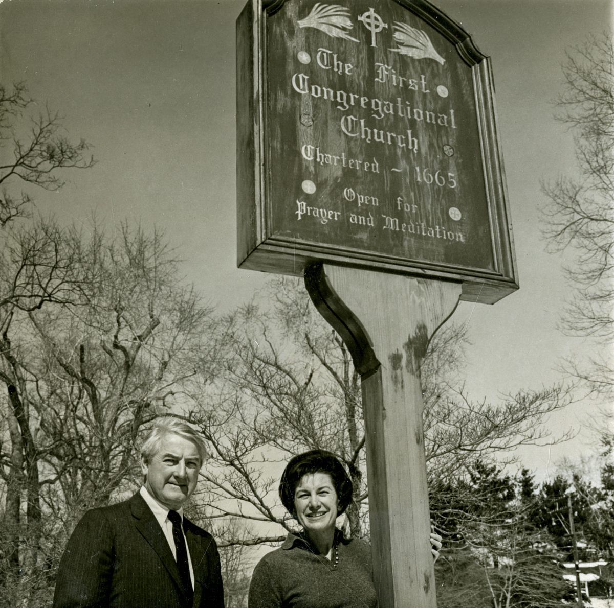 A man and woman standing by the sign for the First Congregational Church that notes the date of its charter in 1665.Collection