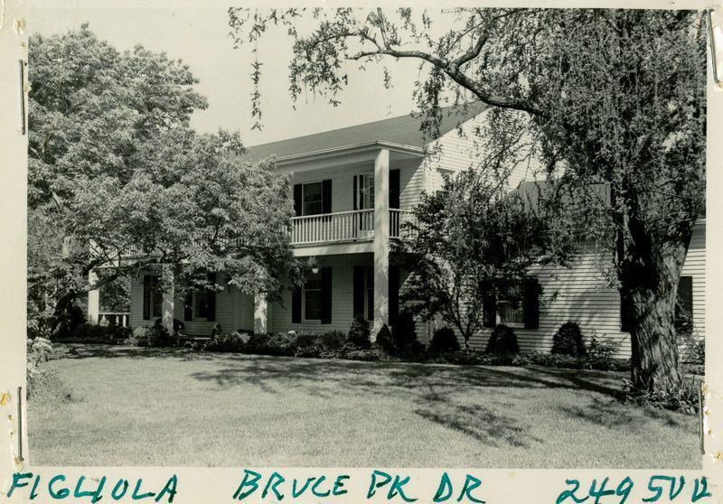 Two story house built in 1970 with an upper porch that cover's its patio, viewed from its lawn.Collection