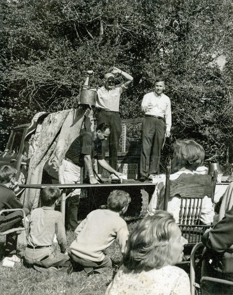 People attending an auction outside of Dingletown Community Church. The people running the auction can be seen standing in the bed of a pick-up truck holding up a metal object.Collection