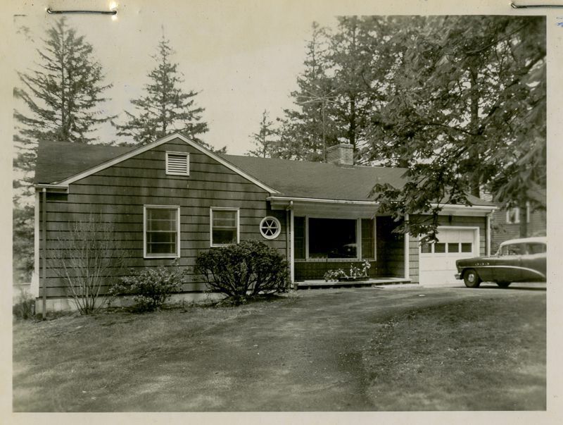 Ranch house built in 1957 with shingle siding and a car parked in front of its garage viewed from its driveway.