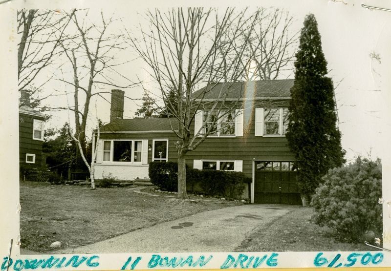 Split level shingled house built in 1954 with a garage viewed from the street.