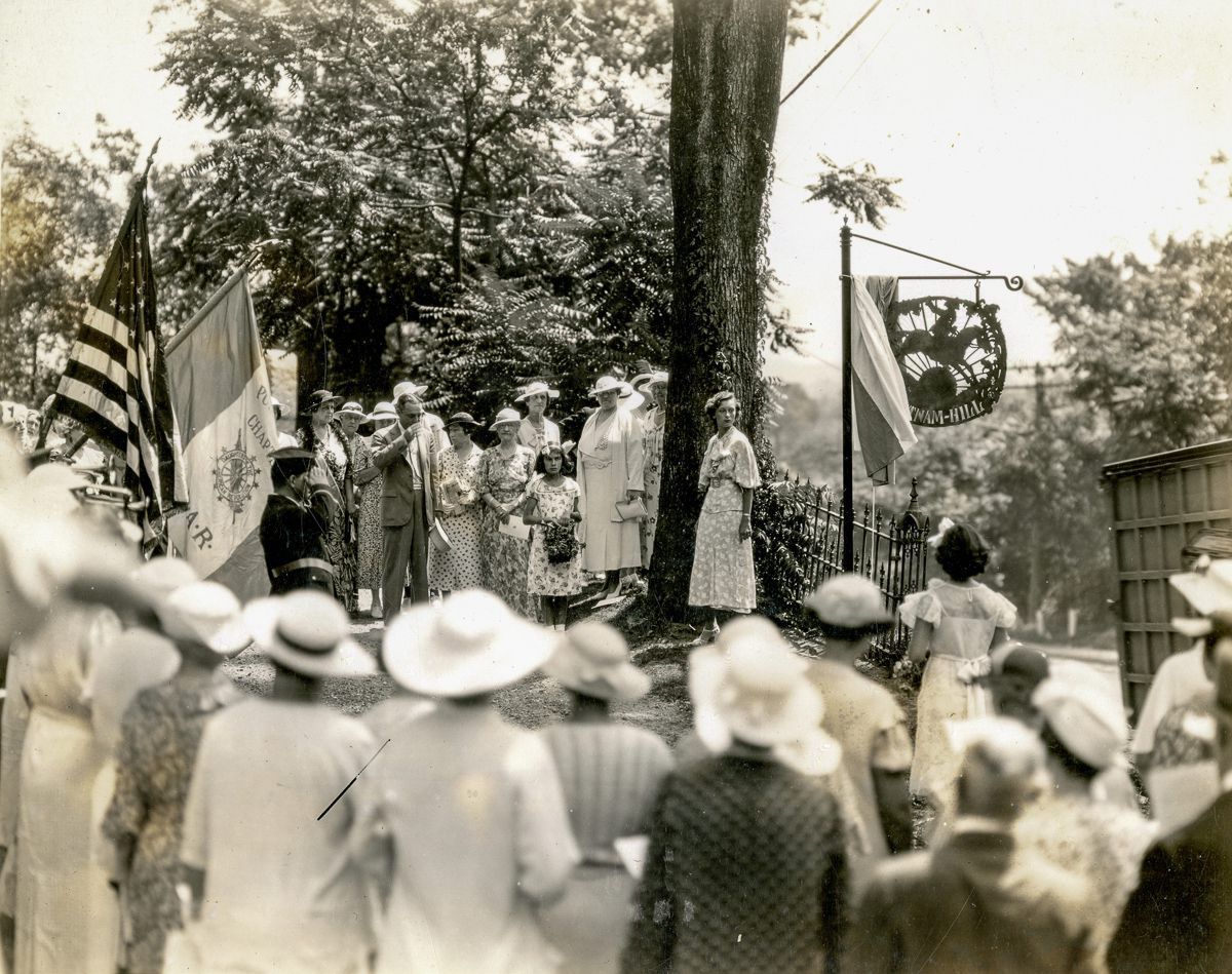 Dedication of the Putnam Hill sign, designed by George Wharton Edwards (the older man standing on the left of the image holding his hat to his chest), for the Connecticut TercentenaryCollection