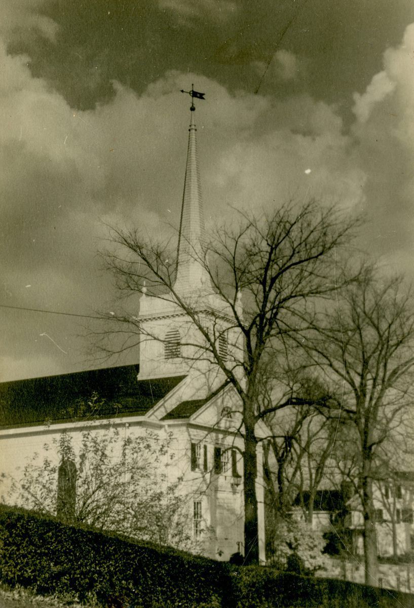 A view of the front and east-side of the First Church of Round Hill.