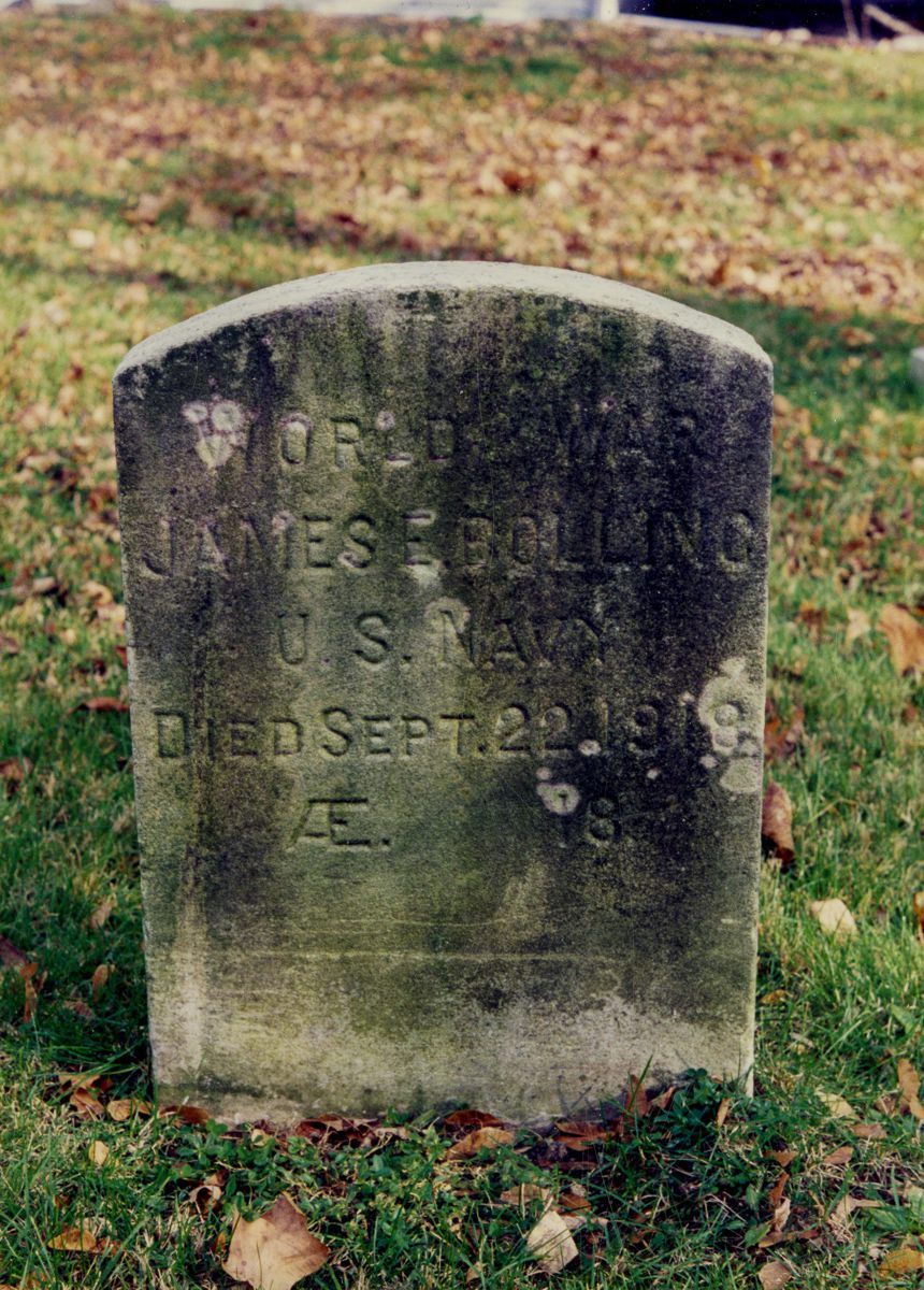 The gravestone of James E. Bolling, a Navy soldier in World War I who died at age 18 on Sept. 22, 1918 in an accidental explosion at the Navy yards in New York; he is buried in the section reserved for "free Blacks" in the southeast corner of Union Cemetery.Collection