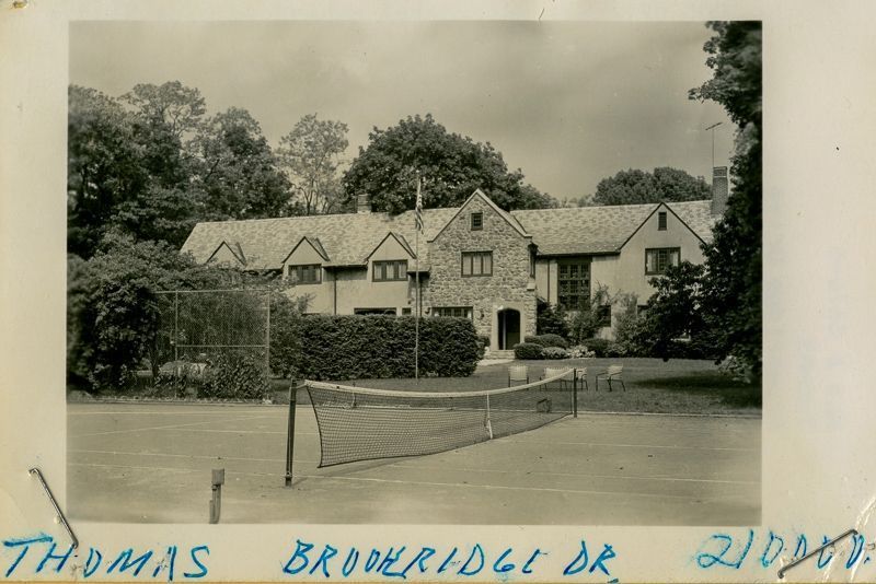 House with stone and stucco walls, built in 1922, viewed from its tennis court.
