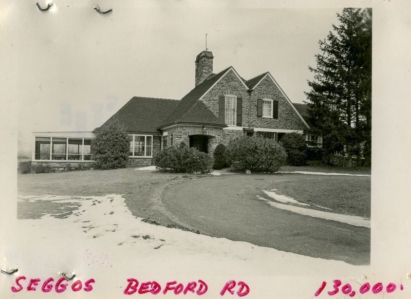 Stone house built in the early 1940's with a hip-and-valley roof and a screened in deck viewed from its driveway.Collection