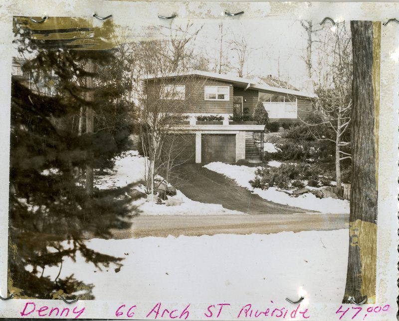 Two story contemporary house built in 1959 with a two door garage in the snow viewed from the street.Collection