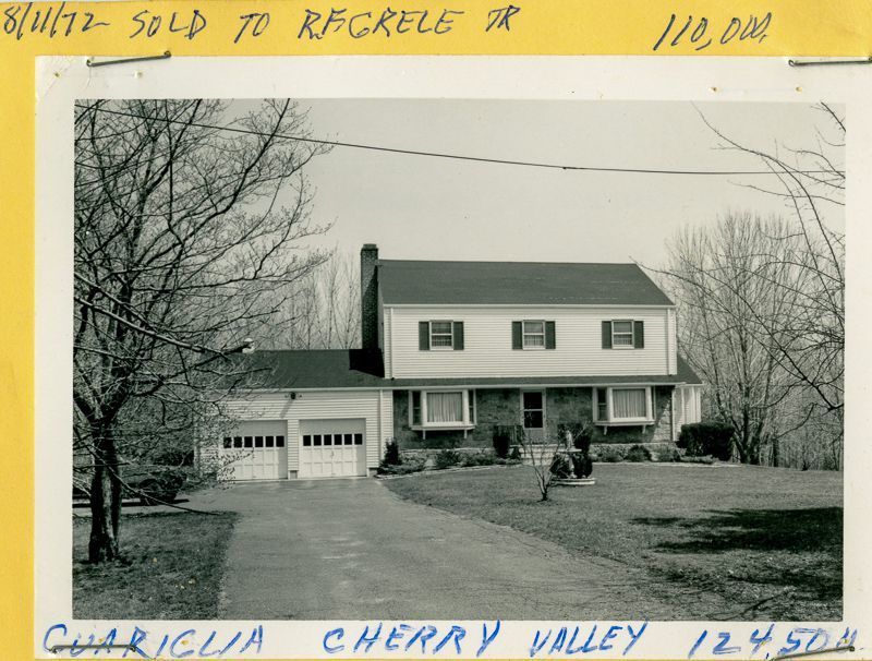 Colonial-style house built in 1957 with a two door garage viewed from its driveway.