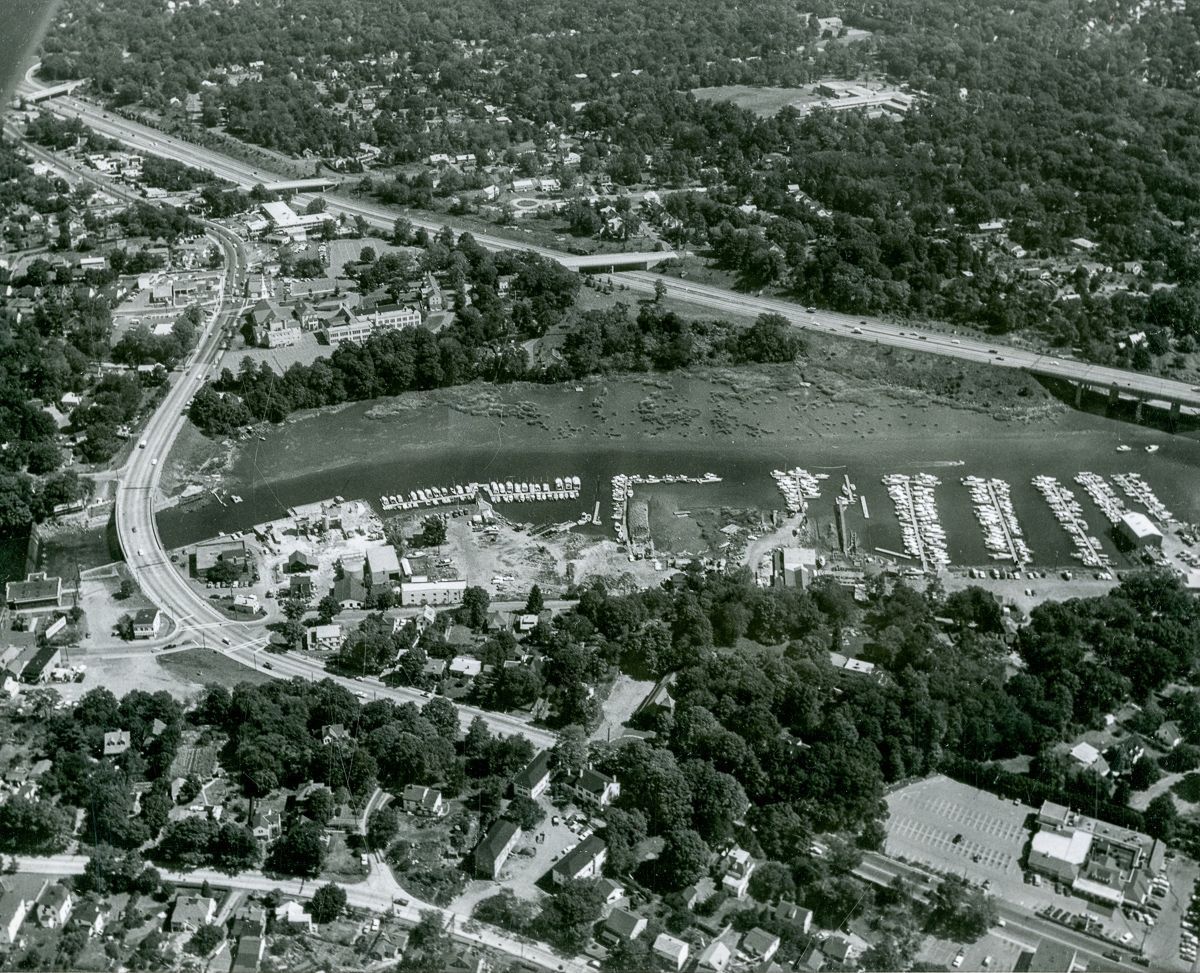 Aerial view of the Mianus River between Interstate 95 and the Mianus River Dam with a view of several marinas in the center of the image.Collection