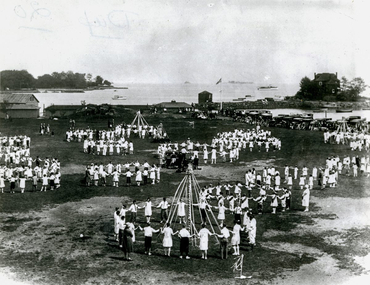 People celebrating May Day by dancing around Maypole's at Byram Park.