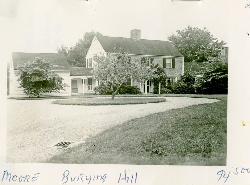 Two story house built in 1951 with a garage attached to it by a small addition and a circular gravel driveway.Collection