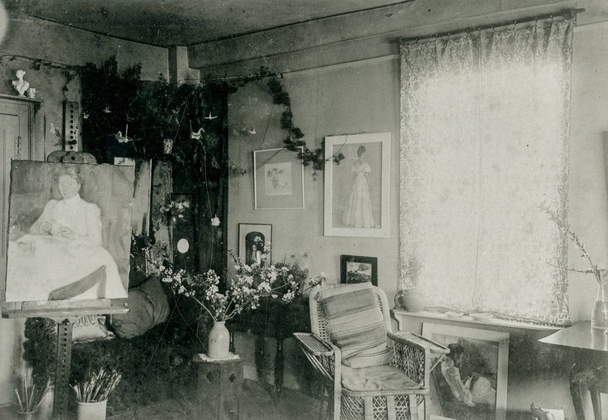 The bedroom of Elmer and Emma MacRae with a bed, origami cranes hanging from string, and numerous works by Elmer MacRae in it.Collection
