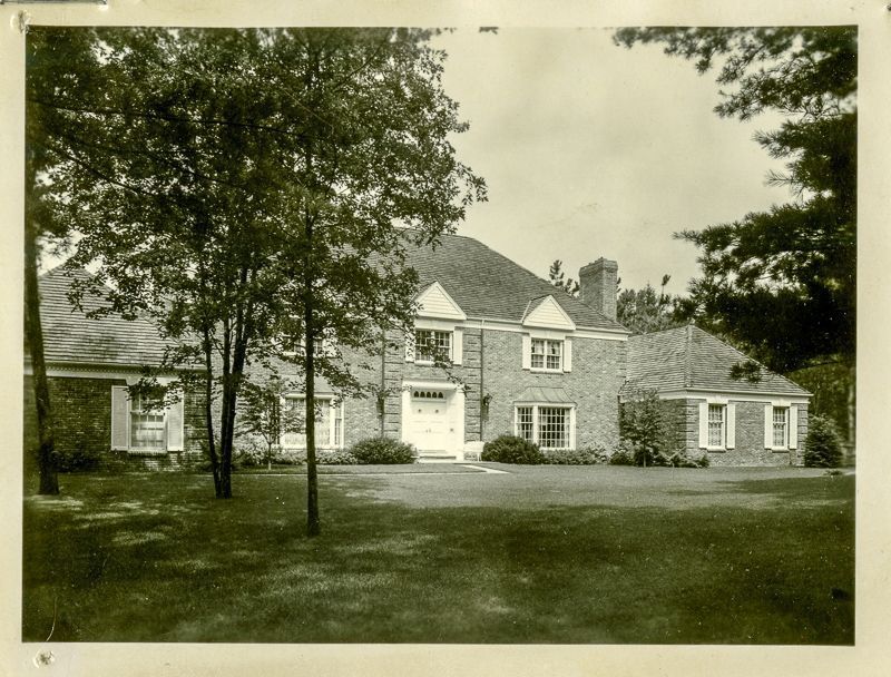 French-style house built in 1963 with brick walls viewed from its lawn.