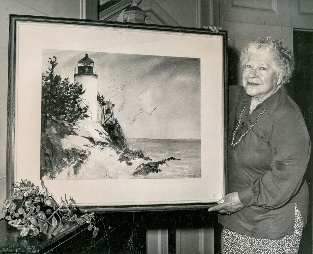 Woman standing with her painting of a seascape titled "Bass Harbor Light."