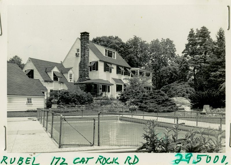 Cape Cod style house built in 1933 viewed from next to its pool.