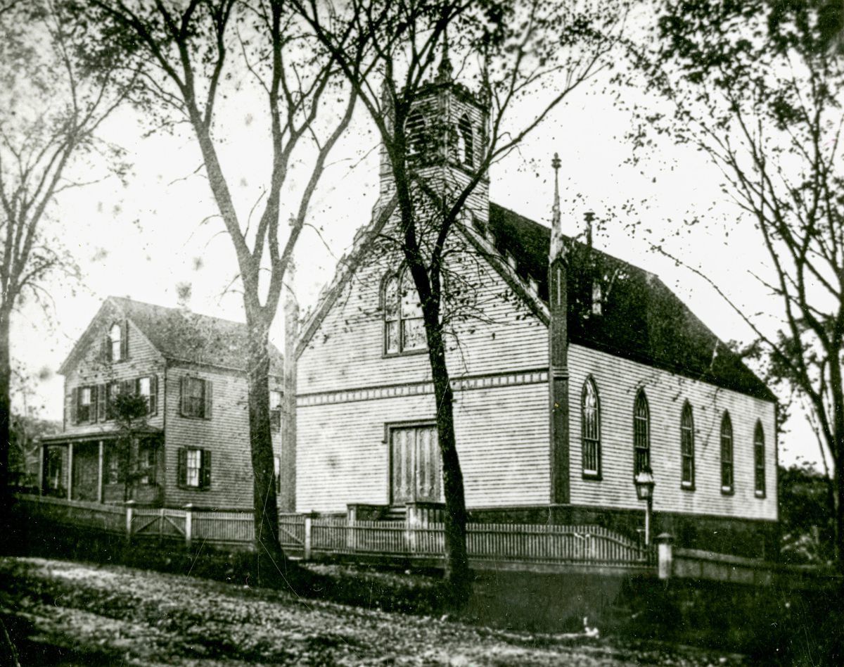 A view of St. Paul Evangelical Lutheran Church's parsonage and its main church, erected in 1866 through gifts from Mr. Rollhaus and Mr. Abendroth, owners of a foundry in Port Chester where much of the congregation worked.Collection
