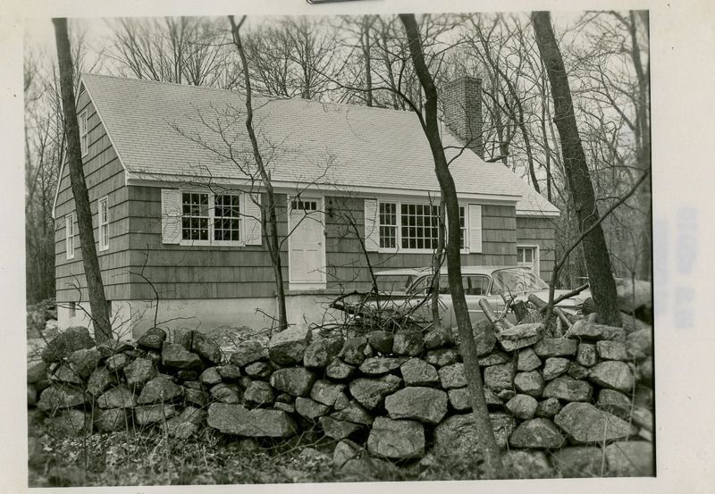Small Cape Cod shingle house with a car parked in front of it and a low dry-stone wall in the foreground.Collection