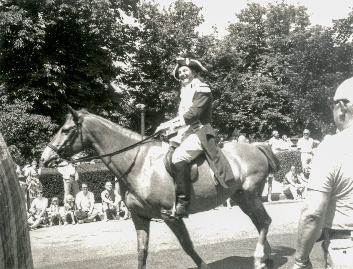 Floats, bands, and reenactors marching in a Bicentennial celebration parade in 1975.Collection