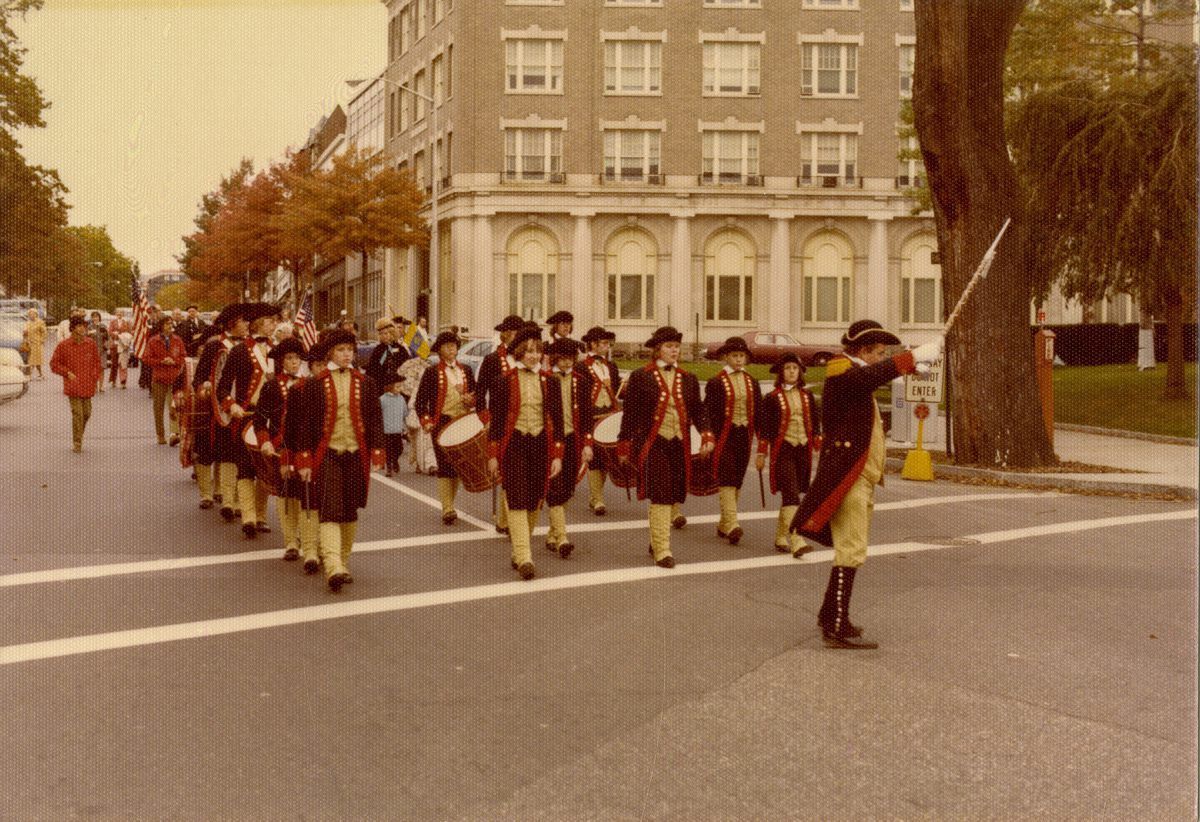 Images of a parade celebrating the bicentennial signing of the Declaration of Independence with many reenactors in Colonial dress.Collection