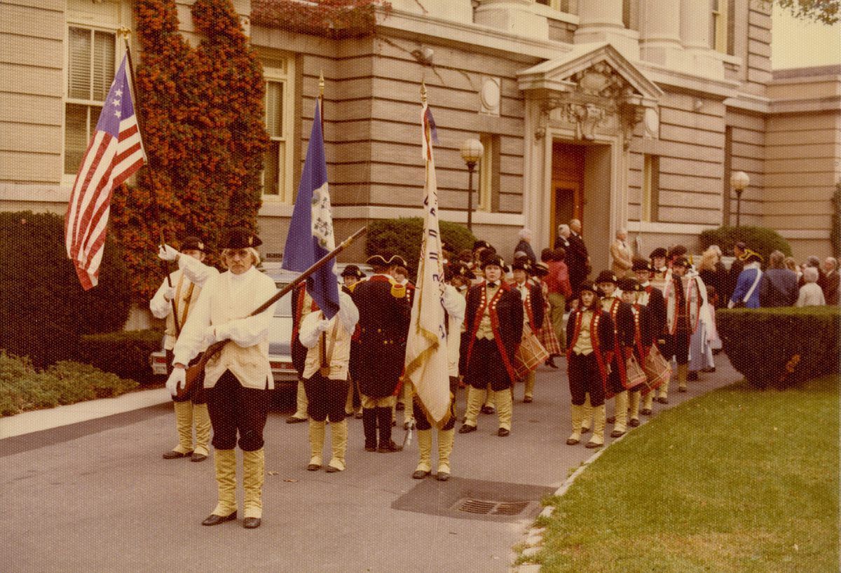 Images of a parade celebrating the bicentennial signing of the Declaration of Independence with many reenactors in Colonial dress.Collection